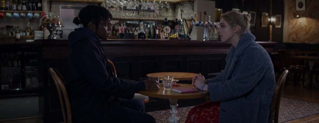 It is a winter evening in London. Aidy, a Black British woman (Anniwaa Buachie), has not turned up to a grief counselling session and is wandering the narrow streets, lost in melancholy. She enters a pub, orders a whisky and takes a lonely seat. She ignores the bartender’s half-hearted attempt to be kind by giving her fries (“the kitchen made a mistake … going to go in the bin otherwise”). It isn’t long before Stella (Tessa Bonham Jones) rocks up to Aidy’s table. Blonde, wearing a red polka dot dress, she announces that she has come to cheer Aidy up.