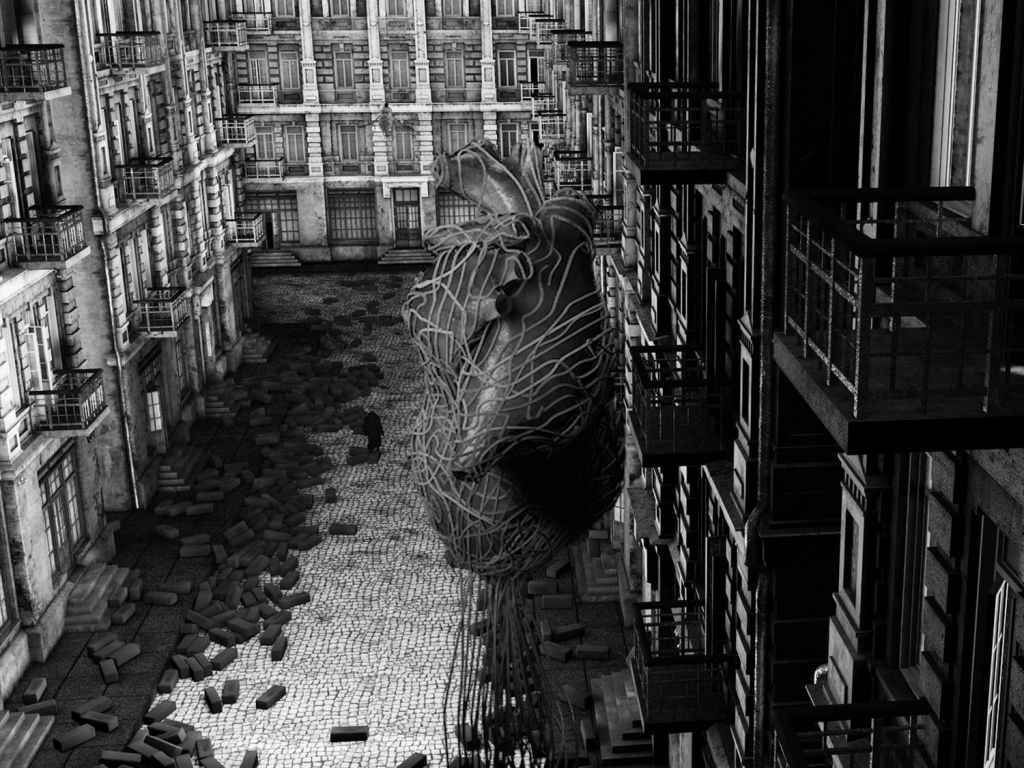 I went to St. Petersburg a few years ago and took photos, but they weren’t really good enough to use so I had to try and evoke the feeling of the city – the regency, the buildings and the Eastern European feel. The only way I could really recreate that was through the 3D software, but it all started with the photographs. I wanted it to be black and white because because I felt it was a great way of unifying all the disparate footage and other elements together. From a practical sense, I could also play with the light and dark and control what is being shown. To use a specific example, the man in a tree with a brain is from Kharm’s writing – he looks up into a tree and sees a man waving, then takes his glasses off to clean them, and without them he can’t see the man. When he puts them back on, however, he sees the guy in the tree shaking a fist at him. I was able to embrace the madness of creating this character.
