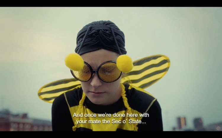 When the idea of the rogue climate activists kidnapping the secretary of state for the environment connected with the Fassbinder reference, I sought to explore the themes that introduce the characters behind the costumes. POWER, BRUTALITY, EXPLOITATION… What else should films be about these days? I wanted to show how these characters that are bent on destroying a system (shit-stem) that abuses its power upon them, brutalises, and exploits them are literally doing just that to each other. It is dense and dialogue heavy but hopefully the humour cuts through and there are enough things happening on the screen to keep you watching.