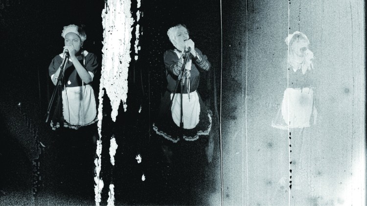 The flashing images were really down to videographer and editor Matt Parsons. We filmed ‘Songs of the Chambermaids’ following a 10-day residency in Portugal in 2021 where myself and the three actresses were developing the piece for a live performance. Pressures of time and money meant that when we got back to England we had to shoot the sequence in just a 4 hour session. Matt still hadn’t seen the performance so didn’t know what to expect – although he had read a draft of the play. Pretty much as soon as we’d finished the filming he was starting to talk about an idea for dropping in subliminal images – related to the themes of the play – an idea he associated with the director Buñuel. Unfortunately, Matt’s crappy old computer that he had at the time couldn’t handle the density of the footage and went into meltdown so it took him another year to get together the resources to get a better machine and we had actually only just finished the current edit when it was submitted for Brighton Rocks. I think we both felt that the performance itself, in filmic terms, wasn’t enough. It somehow needed more. More distress. I identified the key places where I thought Matt’s subliminal interventions would work then left him to it. We also bought in a lot of extra film damage so that we could disrupt the surface textures – sometimes quite violently – throughout the piece. Matt feels it helps the words make sense and I think he’s right.