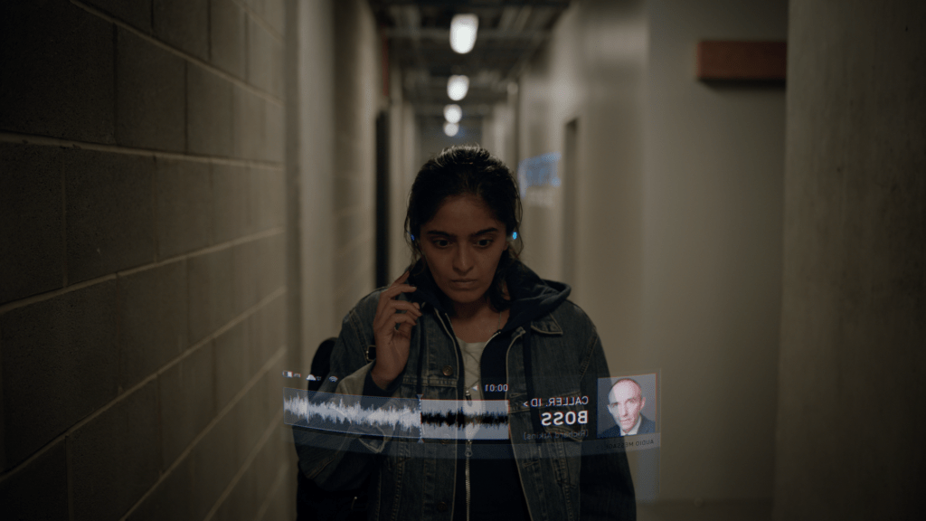 Fenwick’s sci-fi romance lulls us into a false sense of security as it opens with light streaming through curtains, birds singing and swathes of emotive classical music and we are introduced to a young couple, deeply in love. However, within no time we are abruptly sequestered into a dystopian, dark and foreboding reality. Technology reigns and the sonic landscape screeches. Gone is the diegetic birdsong, replaced by the foreboding hum of computers. At this point, we don’t entirely understand where our lonely coder Anna, played by Mandeep Dhillon, had been with her lover. Is it a memory? Is it a dream or a fantasy? Wherever it is, it is a life infinitely better than scrolling on her device in a clinical room being lorded over by management who can’t even be bothered to stop and talk to her.