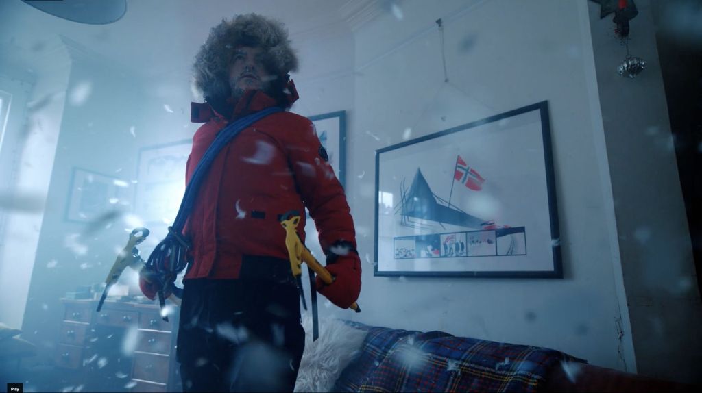 The snowstorm is made of feathers because our character is lying in his front room on a couch with a cushion under his head at the time. The reality / imagined worlds are blurring and I wanted to pull that all the way through the scene. We were working with the art director who created the snow from a feather pillow and a fan. We worked hard to get the movement of snow right, as it doesn’t just fall – it flutters and floats and we worked on a few iterations to get the movement right and build out the storm in post.